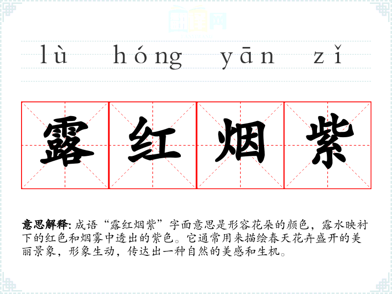 成语“露红烟紫”字面意思是形容花朵的颜色,露水映衬下的红色和烟雾中透出的紫色。它通常用来描绘春天花卉盛开的美丽景象,形象生动,传达出一种自然的美感和生机。