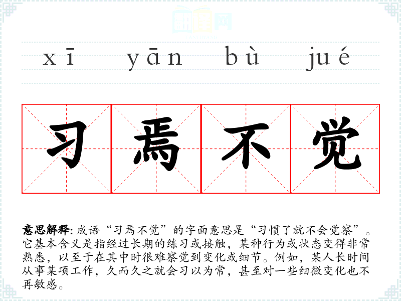 | 习焉不觉 | 习:习惯;焉:语气助词,相当于“于是”的意思。指习惯于某种事物而觉察不到其中的问题。 |