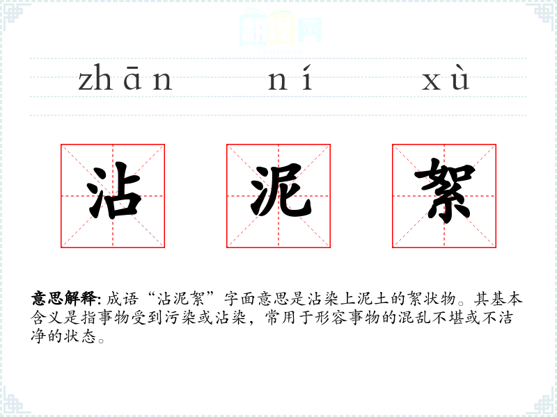 成语“沾泥絮”字面意思是沾染上泥土的絮状物。其基本含义是指事物受到污染或沾染,常用于形容事物的混乱不堪或不洁净的状态。