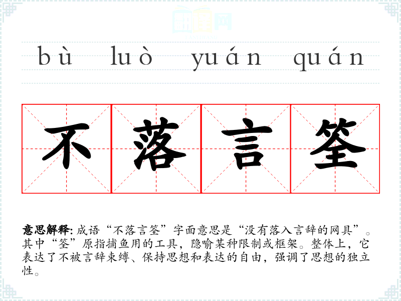 成语“不落言筌”字面意思是“没有落入言辞的网具”。其中“筌”原指捕鱼用的工具,隐喻某种限制或框架。整体上,它表达了不被言辞束缚、保持思想和表达的自由,强调了思想的独立性。