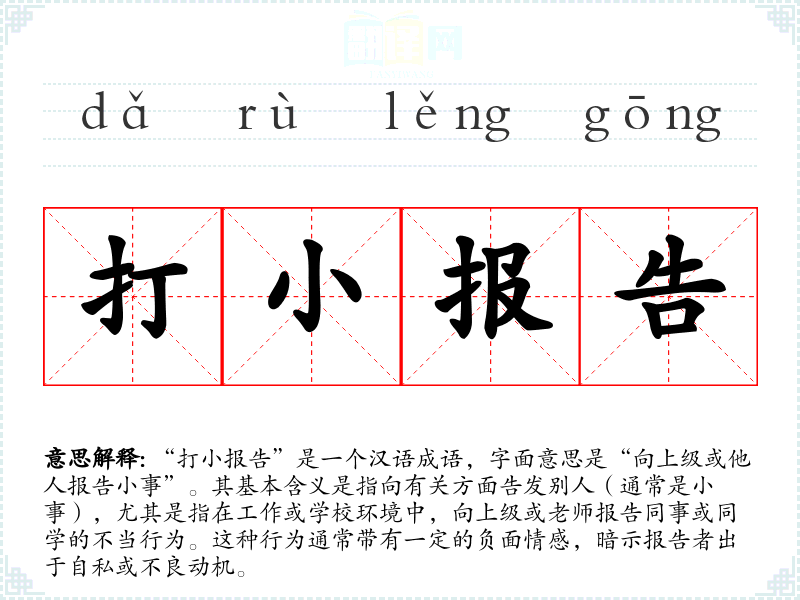 “打小报告”是一个汉语成语,字面意思是“向上级或他人报告小事”。其基本含义是指向有关方面告发别人(通常是小事),尤其是指在工作或学校环境中,向上级或老师报告同事或同学的不当行为。这种行为通常带有一定的负面情感,暗示报告者出于自私或不良动机。