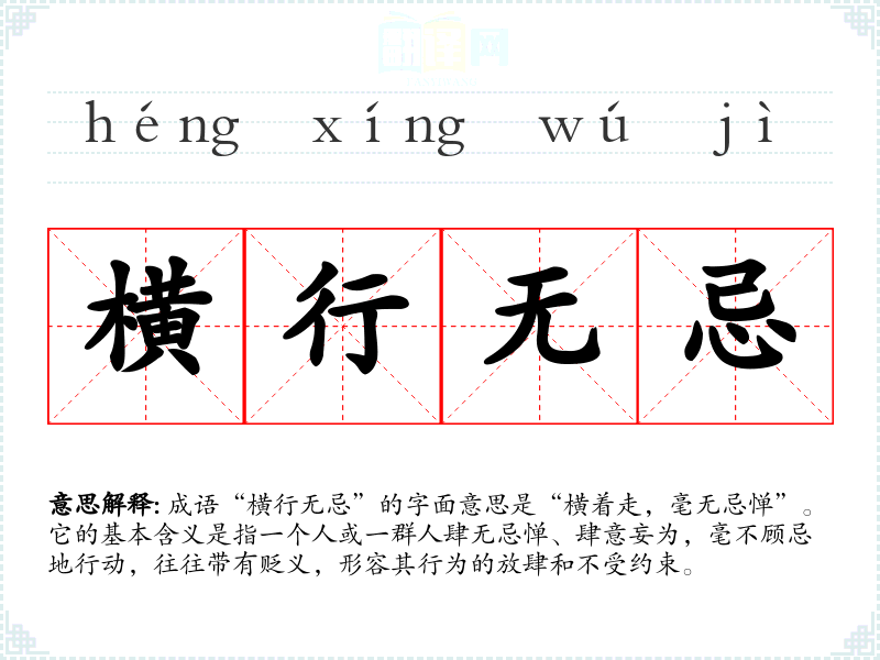 成语“横行无忌”的字面意思是“横着走,毫无忌惮”。它的基本含义是指一个人或一群人肆无忌惮、肆意妄为,毫不顾忌地行动,往往带有贬义,形容其行为的放肆和不受约束。