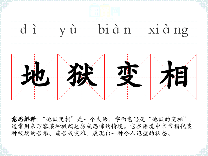 “地狱变相”是一个成语,字面意思是“地狱的变相”,通常用来形容某种极端恶劣或恐怖的情境。它在语境中常常指代某种极端的苦难、痛苦或灾难,展现出一种令人绝望的状态。