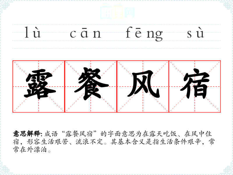 成语“露餐风宿”的字面意思为在露天吃饭、在风中住宿,形容生活艰苦、流浪不定。其基本含义是指生活条件艰辛,常常在外漂泊。