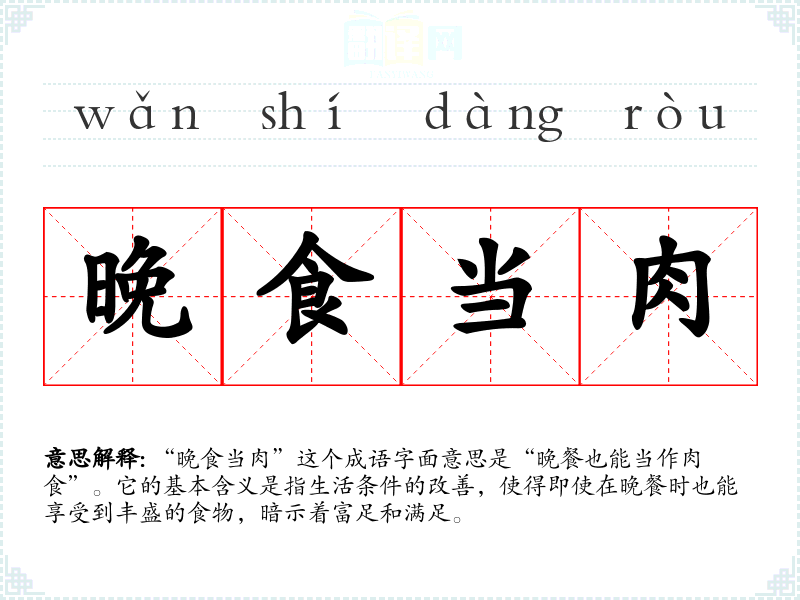 “晚食当肉”这个成语字面意思是“晚餐也能当作肉食”。它的基本含义是指生活条件的改善,使得即使在晚餐时也能享受到丰盛的食物,暗示着富足和满足。
