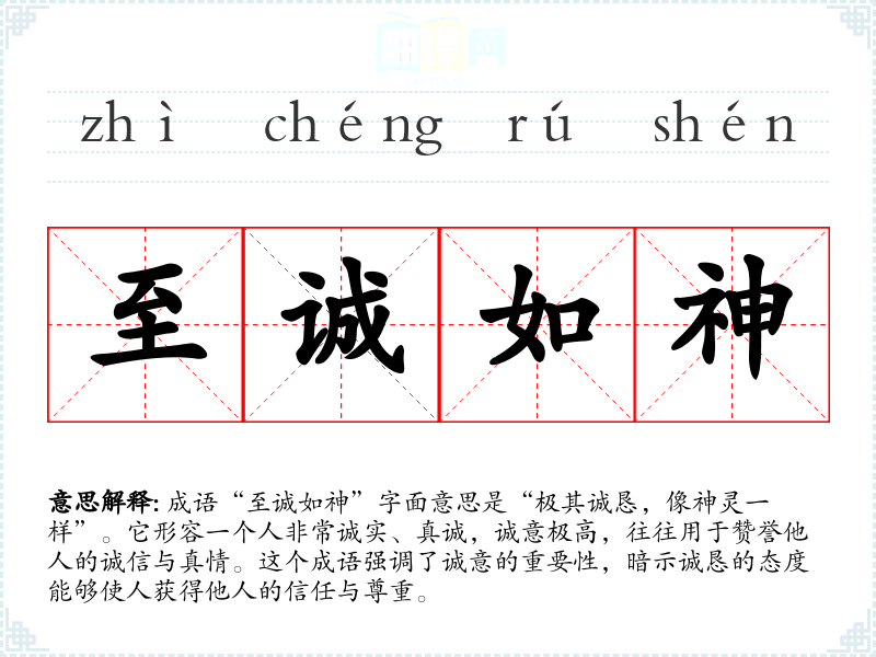 成语“至诚如神”字面意思是“极其诚恳,像神灵一样”。它形容一个人非常诚实、真诚,诚意极高,往往用于赞誉他人的诚信与真情。这个成语强调了诚意的重要性,暗示诚恳的态度能够使人获得他人的信任与尊重。
