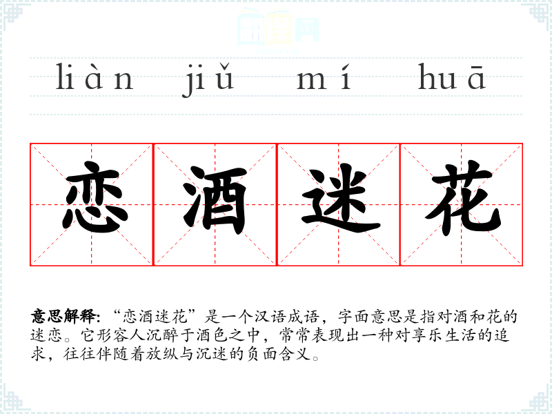 “恋酒迷花”是一个汉语成语,字面意思是指对酒和花的迷恋。它形容人沉醉于酒色之中,常常表现出一种对享乐生活的追求,往往伴随着放纵与沉迷的负面含义。