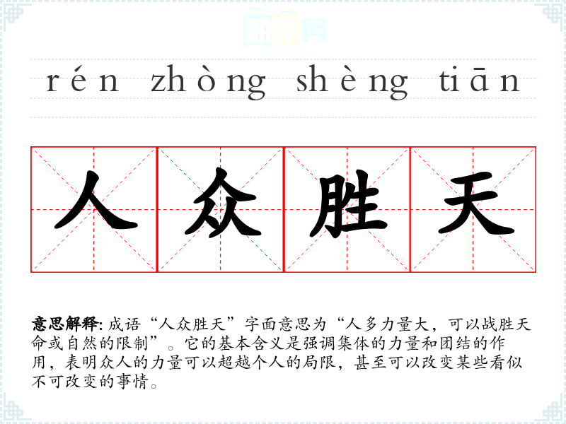 成语“人众胜天”字面意思为“人多力量大,可以战胜天命或自然的限制”。它的基本含义是强调集体的力量和团结的作用,表明众人的力量可以超越个人的局限,甚至可以改变某些看似不可改变的事情。