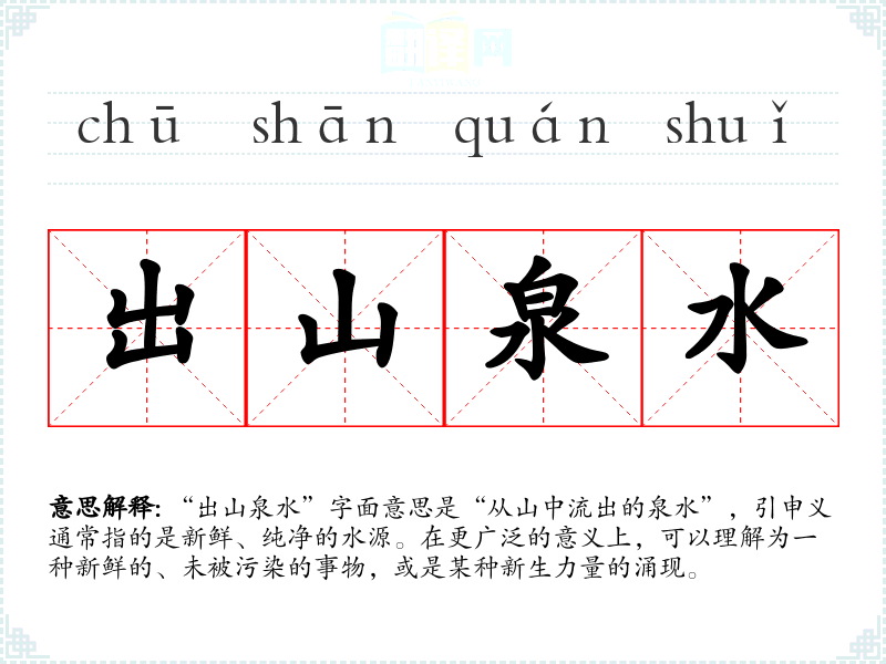 “出山泉水”字面意思是“从山中流出的泉水”,引申义通常指的是新鲜、纯净的水源。在更广泛的意义上,可以理解为一种新鲜的、未被污染的事物,或是某种新生力量的涌现。