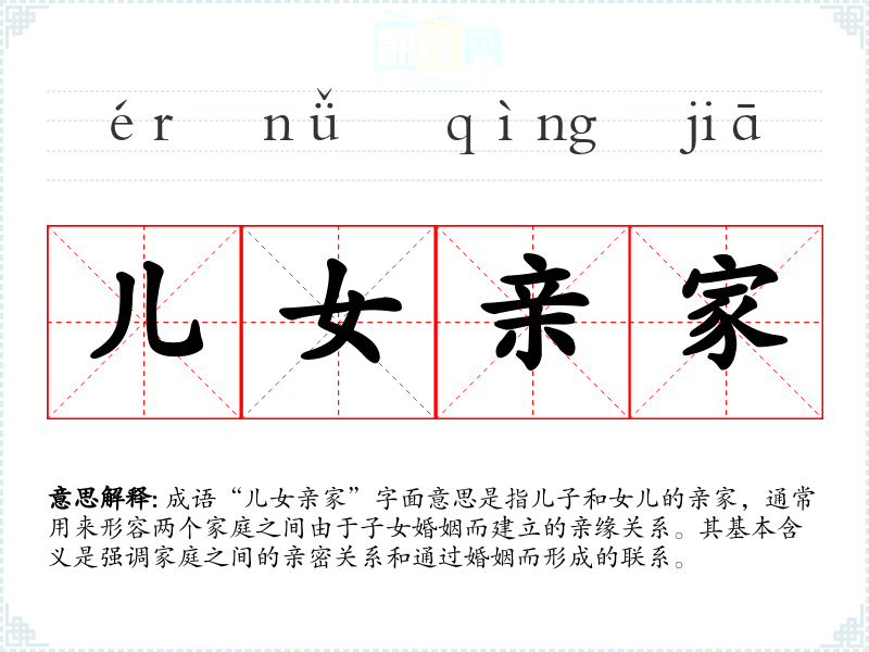 成语“儿女亲家”字面意思是指儿子和女儿的亲家,通常用来形容两个家庭之间由于子女婚姻而建立的亲缘关系。其基本含义是强调家庭之间的亲密关系和通过婚姻而形成的联系。