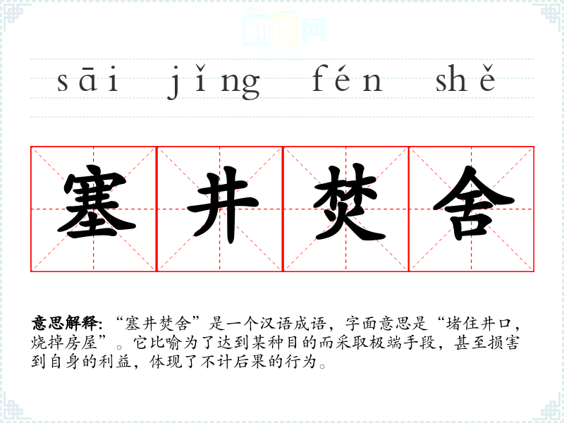“塞井焚舍”是一个汉语成语,字面意思是“堵住井口,烧掉房屋”。它比喻为了达到某种目的而采取极端手段,甚至损害到自身的利益,体现了不计后果的行为。