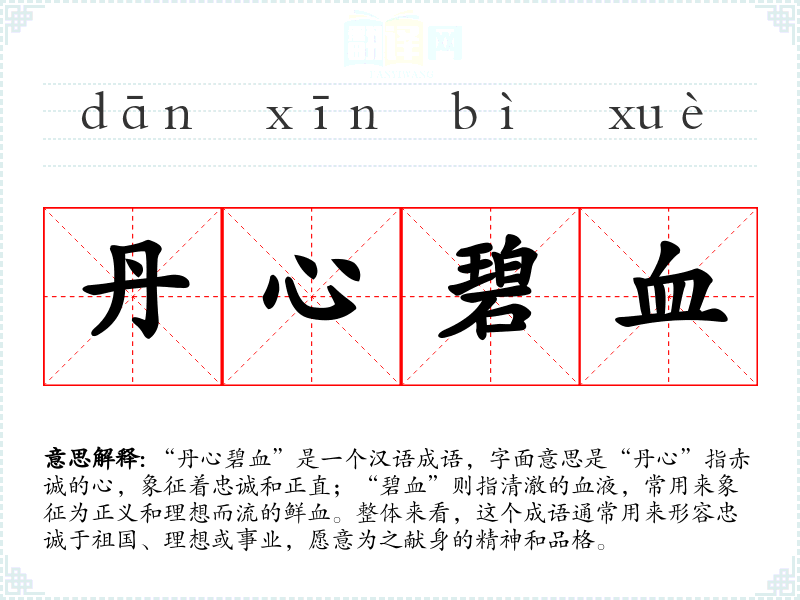 “丹心碧血”是一个汉语成语,字面意思是“丹心”指赤诚的心,象征着忠诚和正直;“碧血”则指清澈的血液,常用来象征为正义和理想而流的鲜血。整体来看,这个成语通常用来形容忠诚于祖国、理想或事业,愿意为之献身的精神和品格。
