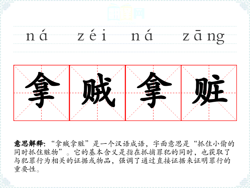 “拿贼拿赃”是一个汉语成语,字面意思是“抓住小偷的同时抓住赃物”。它的基本含义是指在抓捕罪犯的同时,也获取了与犯罪行为相关的证据或物品,强调了通过直接证据来证明罪行的重要性。
