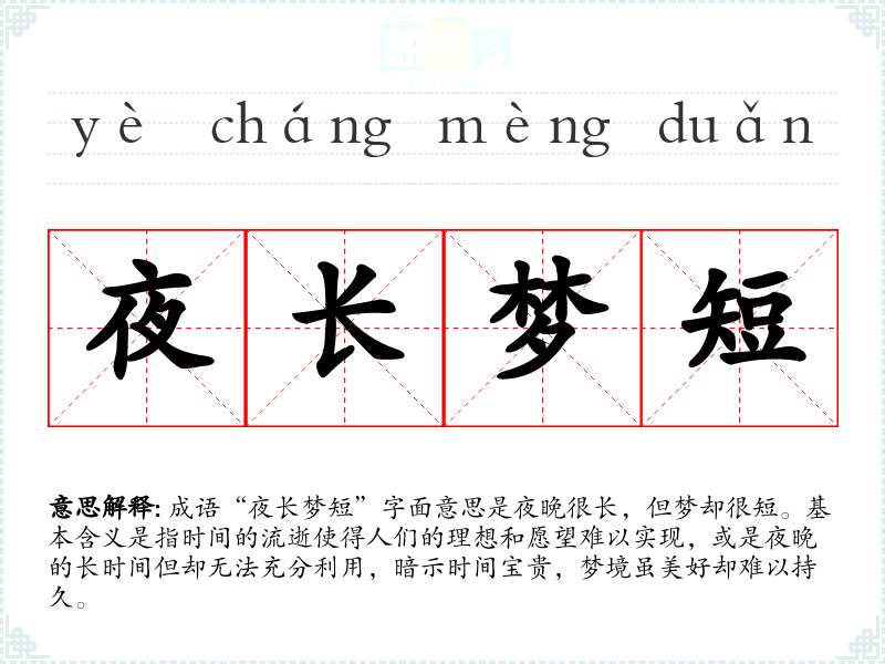 成语“夜长梦短”字面意思是夜晚很长,但梦却很短。基本含义是指时间的流逝使得人们的理想和愿望难以实现,或是夜晚的长时间但却无法充分利用,暗示时间宝贵,梦境虽美好却难以持久。