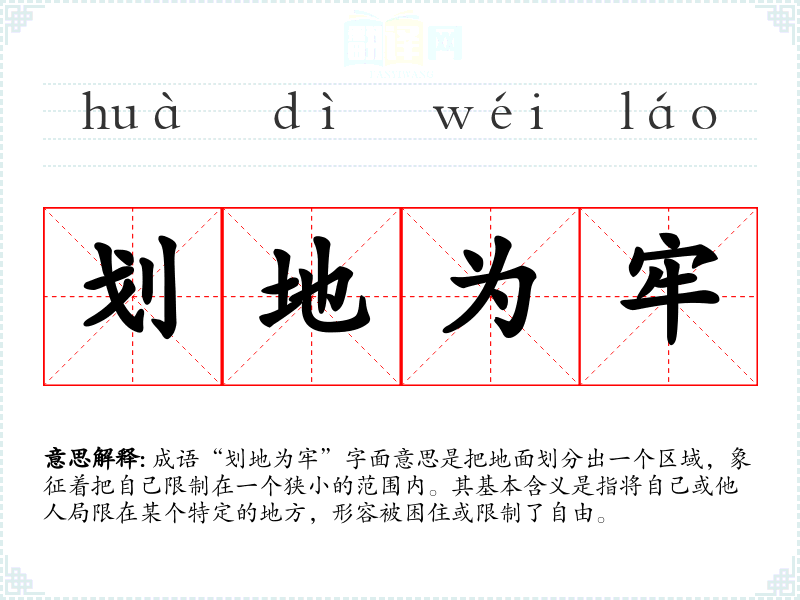 成语“划地为牢”字面意思是把地面划分出一个区域,象征着把自己限制在一个狭小的范围内。其基本含义是指将自己或他人局限在某个特定的地方,形容被困住或限制了自由。