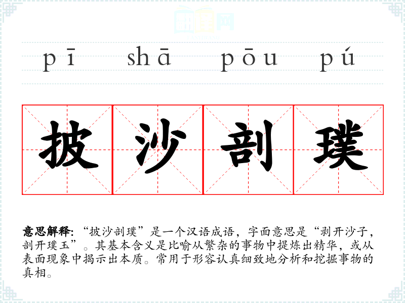 “披沙剖璞”是一个汉语成语,字面意思是“剥开沙子,剖开璞玉”。其基本含义是比喻从繁杂的事物中提炼出精华,或从表面现象中揭示出本质。常用于形容认真细致地分析和挖掘事物的真相。