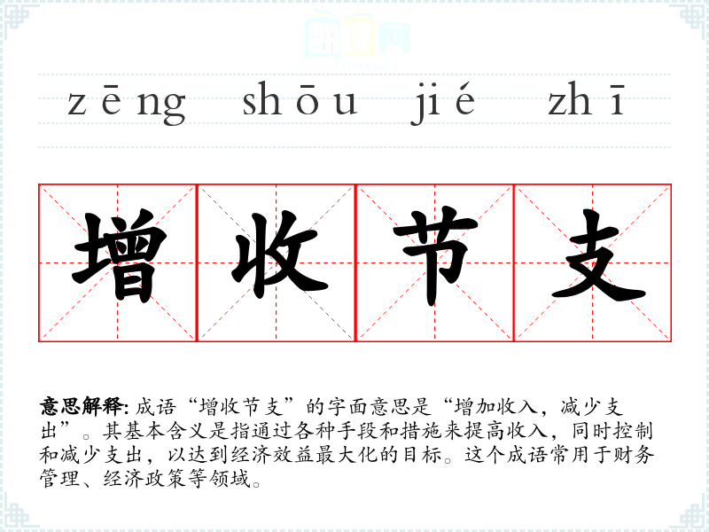 成语“增收节支”的字面意思是“增加收入,减少支出”。其基本含义是指通过各种手段和措施来提高收入,同时控制和减少支出,以达到经济效益最大化的目标。这个成语常用于财务管理、经济政策等领域。