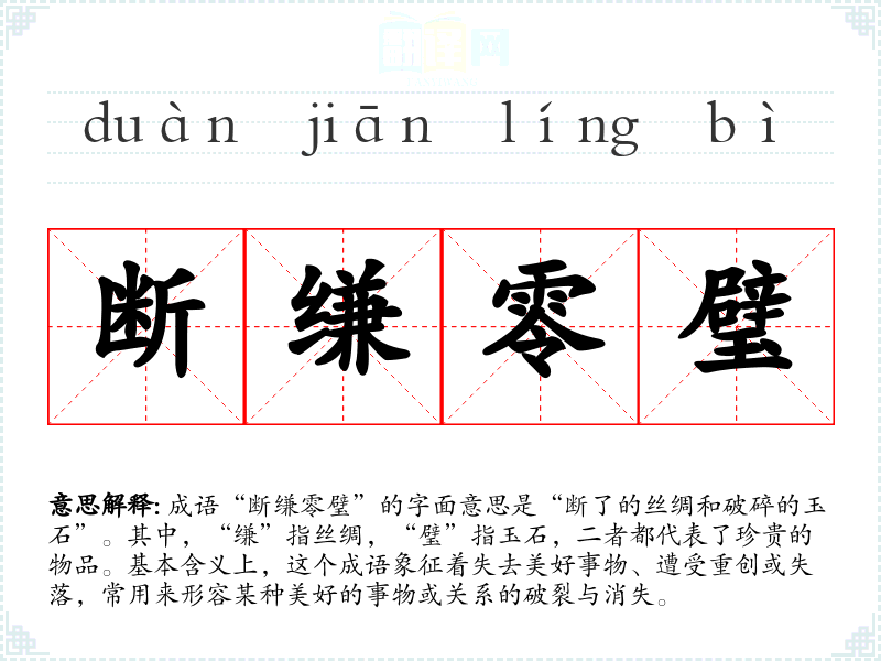 成语“断缣零璧”的字面意思是“断了的丝绸和破碎的玉石”。其中,“缣”指丝绸,“璧”指玉石,二者都代表了珍贵的物品。基本含义上,这个成语象征着失去美好事物、遭受重创或失落,常用来形容某种美好的事物或关系的破裂与消失。