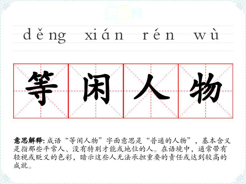 成语“等闲人物”字面意思是“普通的人物”,基本含义是指那些平常人、没有特别才能或地位的人。在语境中,通常带有轻视或贬义的色彩,暗示这些人无法承担重要的责任或达到较高的成就。