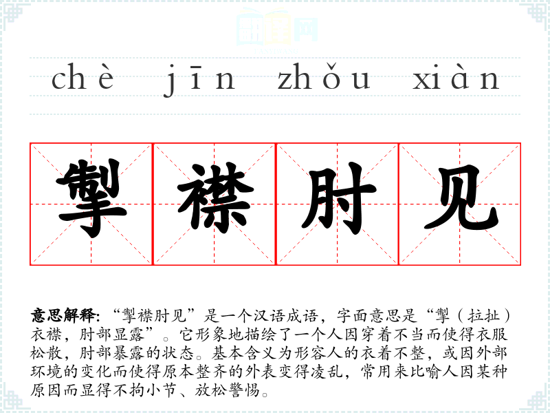 | 掣襟肘见 | 掣:牵拉;襟:衣襟。指捉襟见肘。形容身陷困境、窘迫不堪。 |