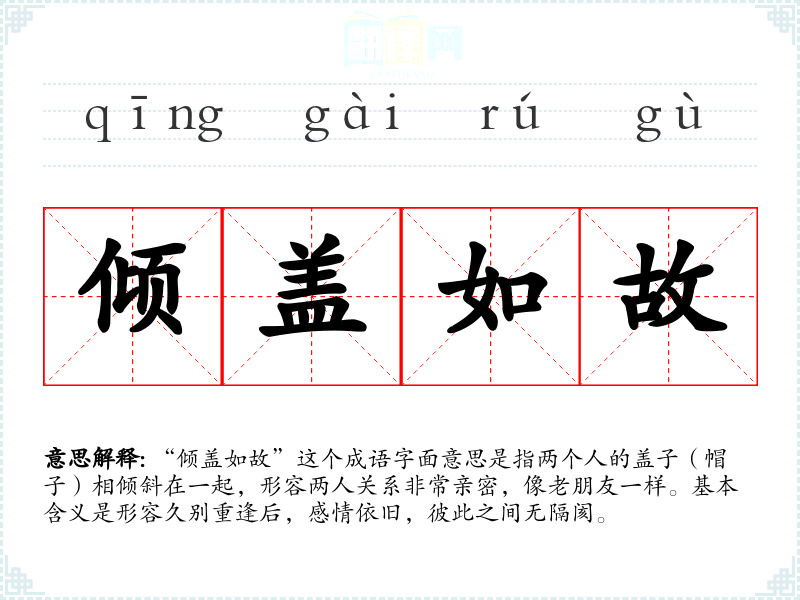 “倾盖如故”这个成语字面意思是指两个人的盖子(帽子)相倾斜在一起,形容两人关系非常亲密,像老朋友一样。基本含义是形容久别重逢后,感情依旧,彼此之间无隔阂。