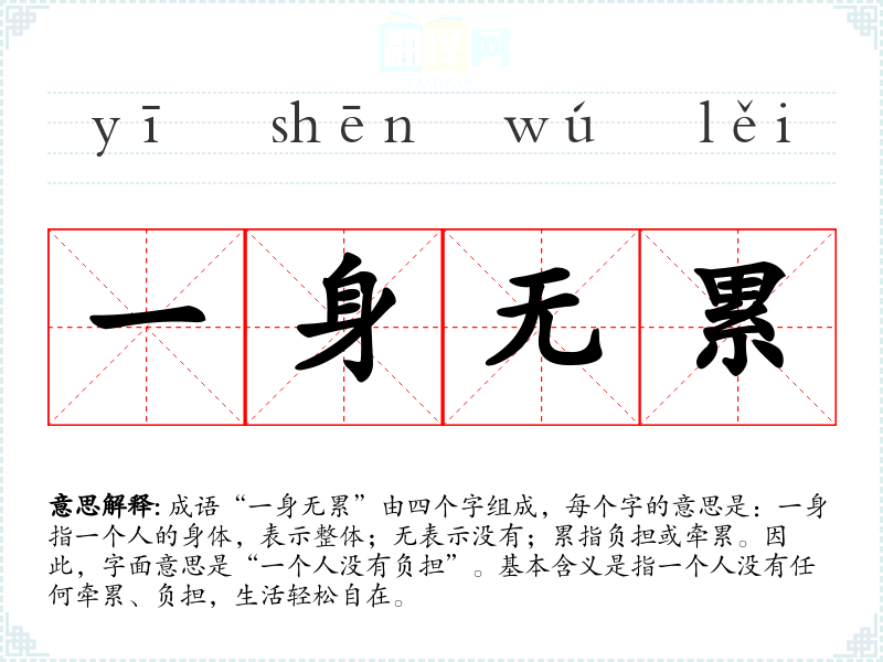 成语“一身无累”由四个字组成,每个字的意思是:一身指一个人的身体,表示整体;无表示没有;累指负担或牵累。因此,字面意思是“一个人没有负担”。基本含义是指一个人没有任何牵累、负担,生活轻松自在。