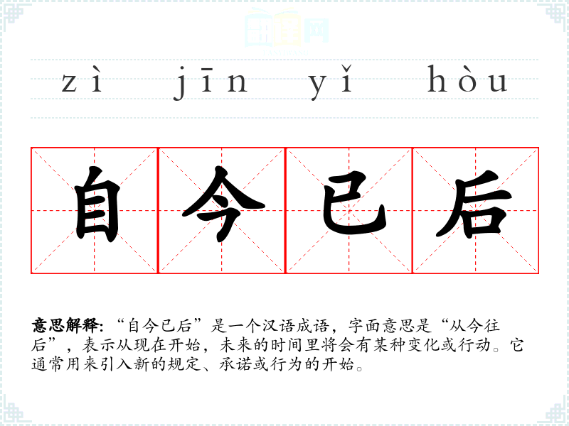 “自今已后”是一个汉语成语,字面意思是“从今往后”,表示从现在开始,未来的时间里将会有某种变化或行动。它通常用来引入新的规定、承诺或行为的开始。
