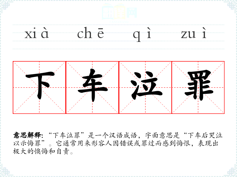 “下车泣罪”是一个汉语成语,字面意思是“下车后哭泣以示悔罪”。它通常用来形容人因错误或罪过而感到悔恨,表现出极大的懊悔和自责。