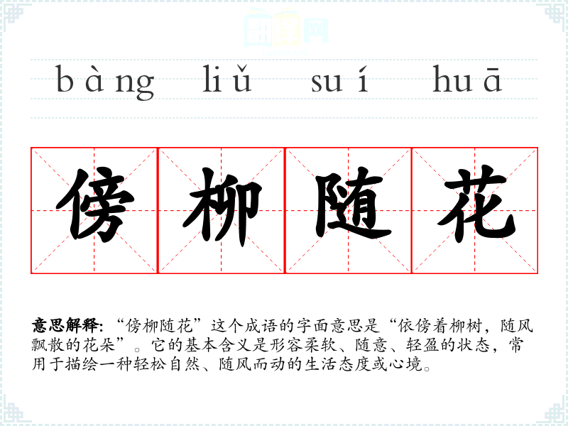 “傍柳随花”这个成语的字面意思是“依傍着柳树,随风飘散的花朵”。它的基本含义是形容柔软、随意、轻盈的状态,常用于描绘一种轻松自然、随风而动的生活态度或心境。