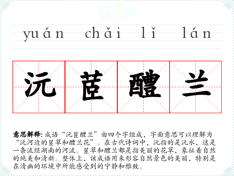 成语“沅茝醴兰”由四个字组成,字面意思可以理解为“沅河边的茝草和醴兰花”。在古代诗词中,沅指的是沅水,这是一条流经湖南的河流。茝草和醴兰都是指美丽的花草,象征着自然的纯美和清新。整体上,该成语用来形容自然景色的美丽,特别是在清幽的环境中所能感受到的宁静和雅致。
