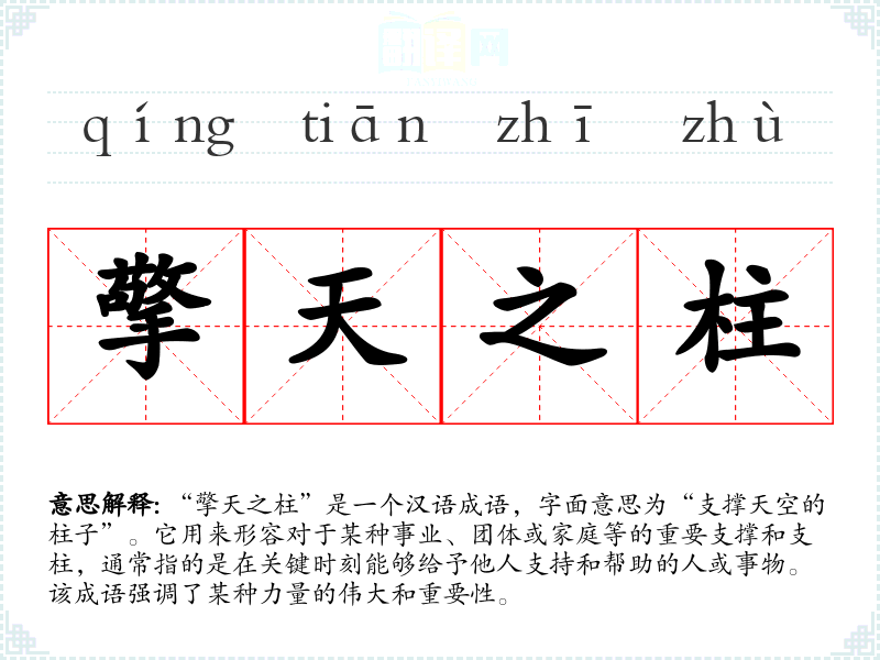 “擎天之柱”是一个汉语成语,字面意思为“支撑天空的柱子”。它用来形容对于某种事业、团体或家庭等的重要支撑和支柱,通常指的是在关键时刻能够给予他人支持和帮助的人或事物。该成语强调了某种力量的伟大和重要性。