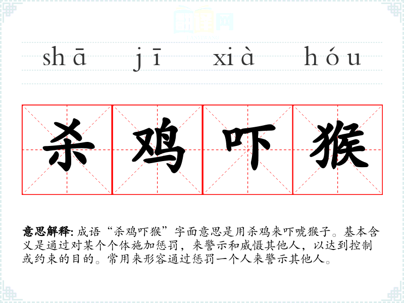 成语“杀鸡吓猴”字面意思是用杀鸡来吓唬猴子。基本含义是通过对某个个体施加惩罚,来警示和威慑其他人,以达到控制或约束的目的。常用来形容通过惩罚一个人来警示其他人。
