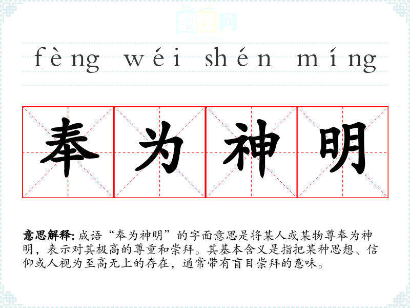 成语“奉为神明”的字面意思是将某人或某物尊奉为神明,表示对其极高的尊重和崇拜。其基本含义是指把某种思想、信仰或人视为至高无上的存在,通常带有盲目崇拜的意味。