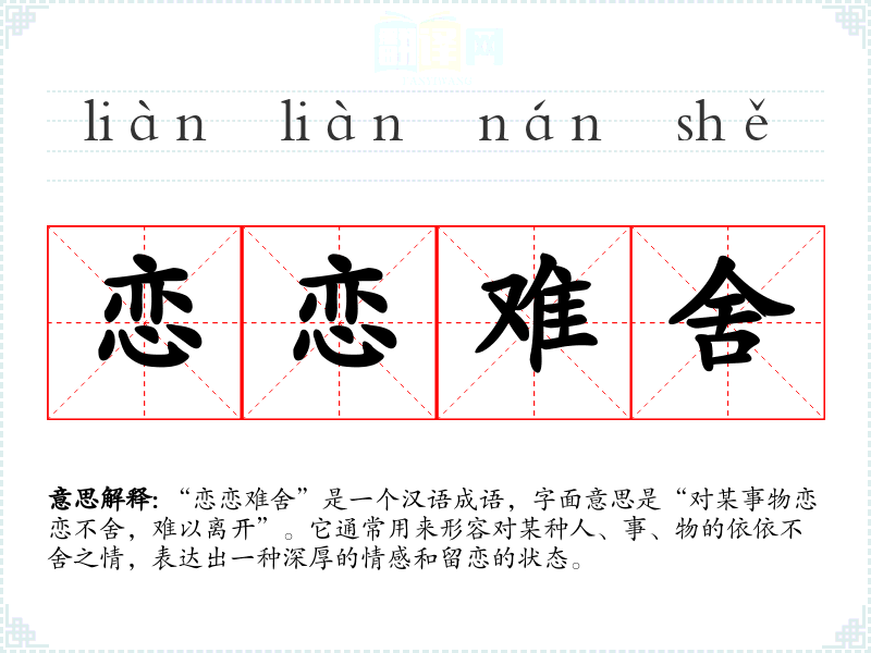 “恋恋难舍”是一个汉语成语,字面意思是“对某事物恋恋不舍,难以离开”。它通常用来形容对某种人、事、物的依依不舍之情,表达出一种深厚的情感和留恋的状态。