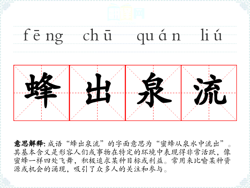 成语“蜂出泉流”的字面意思为“蜜蜂从泉水中流出”。其基本含义是形容人们或事物在特定的环境中表现得非常活跃,像蜜蜂一样四处飞舞,积极追求某种目标或利益。常用来比喻某种资源或机会的涌现,吸引了众多人的关注和参与。