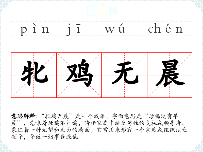 “牝鸡无晨”是一个成语,字面意思是“母鸡没有早晨”,意味着母鸡不打鸣,暗指家庭中缺乏男性的支柱或领导者,象征着一种无望和无力的局面。它常用来形容一个家庭或组织缺乏领导,导致一切事务混乱。