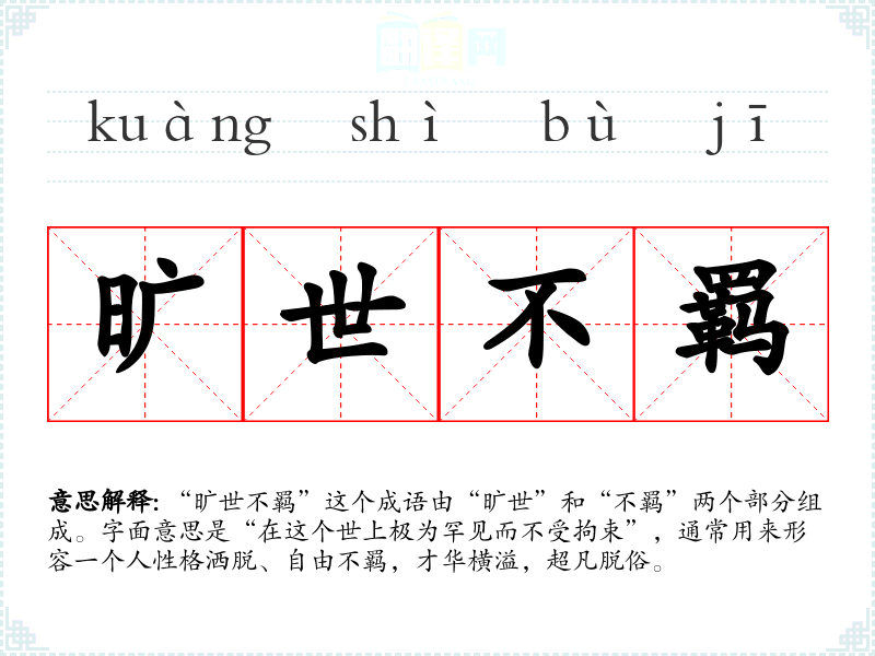 “旷世不羁”这个成语由“旷世”和“不羁”两个部分组成。字面意思是“在这个世上极为罕见而不受拘束”,通常用来形容一个人性格洒脱、自由不羁,才华横溢,超凡脱俗。