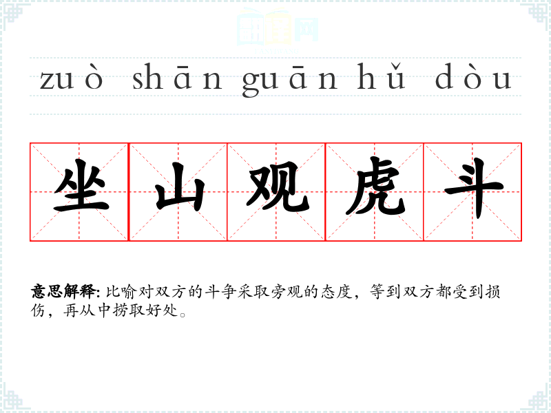 | 坐山看虎斗 | 比喻暂不介入双方的斗争中,等到双方都受到损伤,再从中捞取好处 |