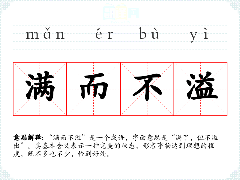 “满而不溢”是一个成语,字面意思是“满了,但不溢出”。其基本含义表示一种完美的状态,形容事物达到理想的程度,既不多也不少,恰到好处。