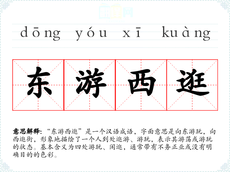 “东游西逛”是一个汉语成语,字面意思是向东游玩,向西逛街,形象地描绘了一个人到处逛游、游玩,表示其游荡或游玩的状态。基本含义为四处游玩、闲逛,通常带有不务正业或没有明确目的的色彩。
