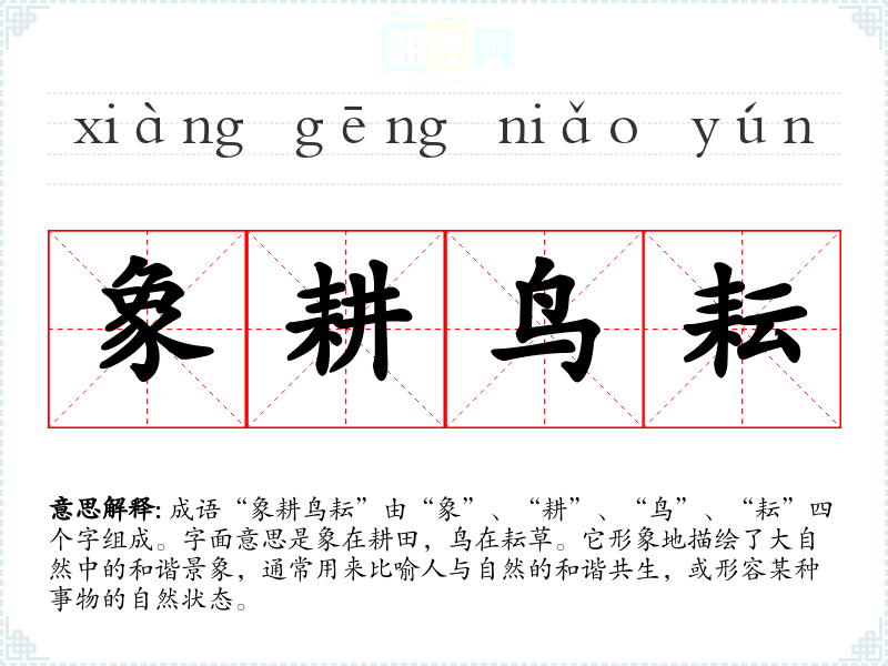 成语“象耕鸟耘”由“象”、“耕”、“鸟”、“耘”四个字组成。字面意思是象在耕田,鸟在耘草。它形象地描绘了大自然中的和谐景象,通常用来比喻人与自然的和谐共生,或形容某种事物的自然状态。