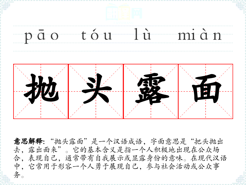 “抛头露面”是一个汉语成语,字面意思是“把头抛出去,露出面来”。它的基本含义是指一个人积极地出现在公众场合,表现自己,通常带有自我展示或显露身份的意味。在现代汉语中,它常用于形容一个人勇于展现自己,参与社会活动或公众事务。