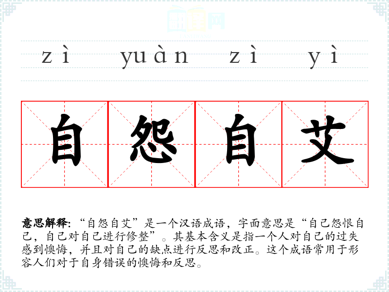 “自怨自艾”是一个汉语成语,字面意思是“自己怨恨自己,自己对自己进行修整”。其基本含义是指一个人对自己的过失感到懊悔,并且对自己的缺点进行反思和改正。这个成语常用于形容人们对于自身错误的懊悔和反思。