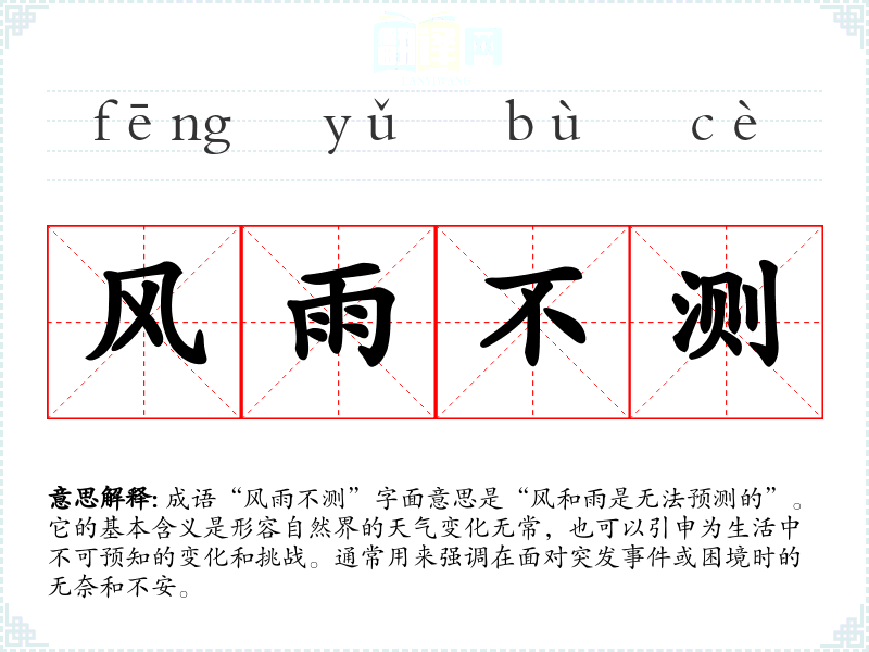 - 日常对话:人们在谈论生活中的不确定性时,可以用“风雨不测”来表达对未来的担忧。