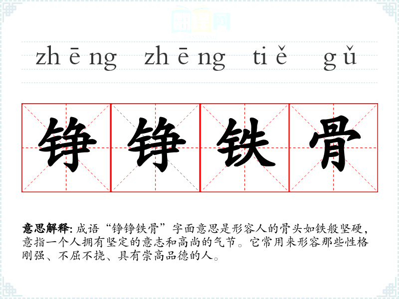 成语“铮铮铁骨”字面意思是形容人的骨头如铁般坚硬,意指一个人拥有坚定的意志和高尚的气节。它常用来形容那些性格刚强、不屈不挠、具有崇高品德的人。