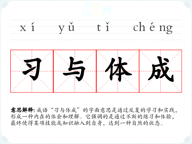 成语“与体成”的字面意思是通过反复的学和实践,形成一种内在的体会和理解。它强调的是通过不断的练*和体验,最终使得某项技能或知识融入到自身,达到一种自然的状态。