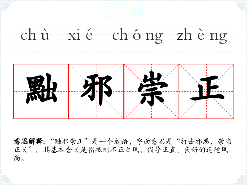 “黜邪崇正”是一个成语,字面意思是“打击邪恶,崇尚正义”。其基本含义是指抵制不正之风,倡导正直、良好的道德风尚。