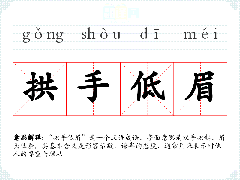 “拱手低眉”是一个汉语成语,字面意思是双手拱起,眉头低垂。其基本含义是形容恭敬、谦卑的态度,通常用来表示对他人的尊重与顺从。