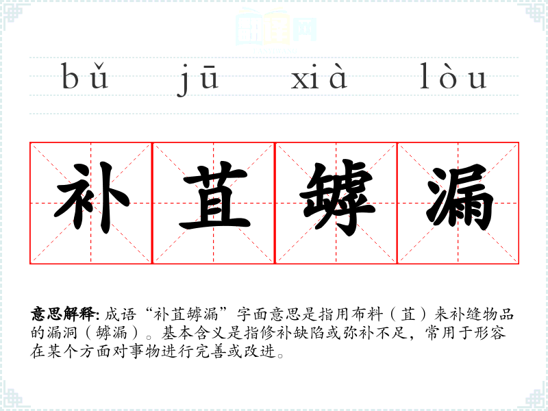 成语“补苴罅漏”字面意思是指用布料(苴)来补缝物品的漏洞(罅漏)。基本含义是指修补缺陷或弥补不足,常用于形容在某个方面对事物进行完善或改进。