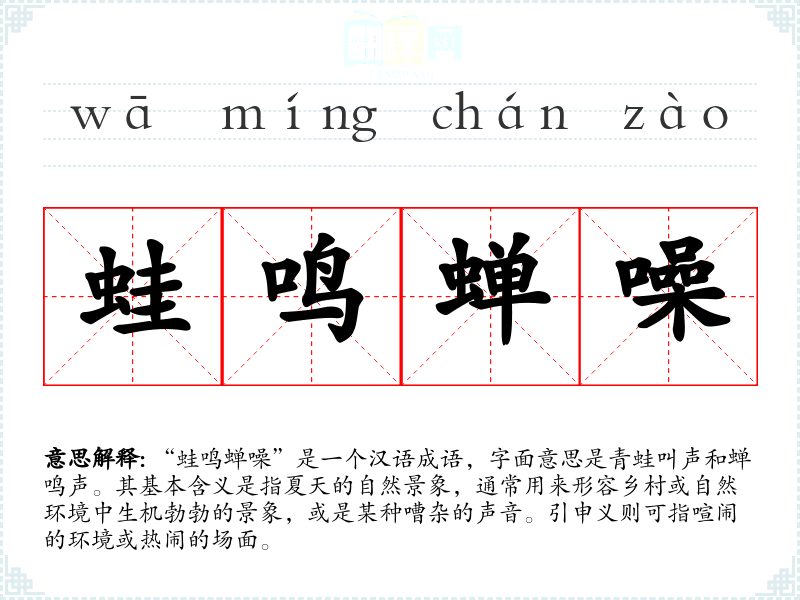 “蛙鸣蝉噪”是一个汉语成语,字面意思是青蛙叫声和蝉鸣声。其基本含义是指夏天的自然景象,通常用来形容乡村或自然环境中生机勃勃的景象,或是某种嘈杂的声音。引申义则可指喧闹的环境或热闹的场面。